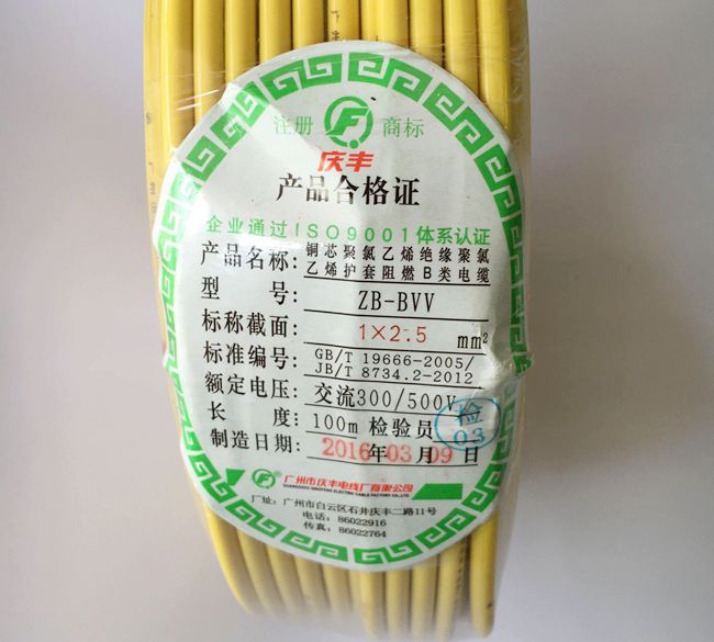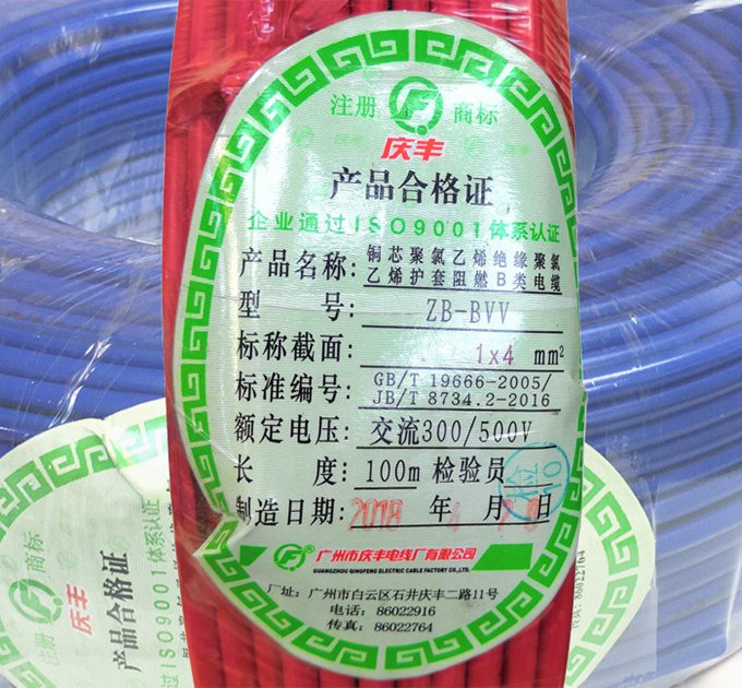 廣州慶豐電纜ZB-BVV阻燃B級家裝電線